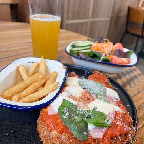 One of the biggest parmi’s I’ve seen. Was delicious chicken with Christmas ham slices on top. Salad was a bit basic but overall excellent